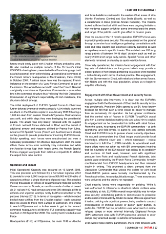 Chad security forces were responsible for policing. While it was authorised to intervene in situations where civilians were immediately at risk, EUFOR’s overall responsibility was for wide area security, undertaking patrols to demonstrate its presence and to deter criminal activity. Under its status of forces agreement it had no policing role or judicial powers, being unable to conduct investigations of criminal activity or punish guilty parties. In particular, EUFOR had no jurisdiction over what went on inside refugee camps or more informal Internally Displaced Person (IDP) settlement sites with EUFOR personnel allowed to enter camps only unarmed except in extreme circumstances.