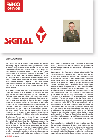 A key theme of this Summer 2019 issue is Leadership. The current Defence Forces Retention Crisis has seen leaders emerge from unexpected sources. The Leadership shown by Veterans and Family Groups through highly vocal and visible social media campaigns and dignified parades for respect and loyalty for Defence Forces personnel have captured the imagination. Analogies have been drawn with the situation that pertained in 1990, when the wives and partners of Defence Forces personnel took to the streets in protest at appalling pay and service conditions. This environment saw the genesis of representation in the Defence Forces, and precipitated the Gleeson Commission, a review of DF remuneration and service conditions. The recent attempts by the Department of Defence to ignore and deny RACO’s right to fully represent our members under DFR S6 is an ongoing threat to representation in the Defence Forces, and one which the Professional Staff will continue to monitor closely. With both recruitment and retention policies continuing to fail in addressing the manning level crisis in the Defence Forces, a comprehensive external review, similar in nature and scope to the Gleeson Commission, should now be considered by Government where Management are unable or unwilling to address the underlying organisational issues.