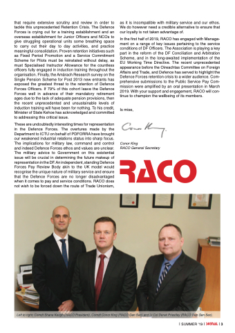 In the first half of 2019, RACO has engaged with Manage- ment on a range of key issues pertaining to the service conditions of DF Officers. The Association is playing a key part in the reform of the DF Conciliation and Arbitration Scheme, and in the long-awaited implementation of the EU Working Time Directive. The recent unprecedented appearance before the Oireachtas Committee on Foreign Affairs and Trade, and Defence has served to highlight the Defence Forces retention crisis to a wider audience. Com- prehensive submissions to the Public Service Pay Com- mission were amplified by an oral presentation in March 2019. With your support and engagement, RACO will con- tinue to champion the wellbeing of its members.