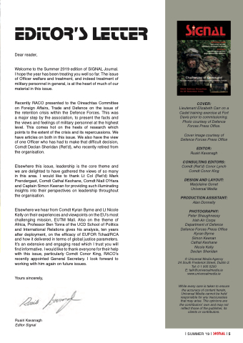 Welcome to the Summer 2019 edition of SIGNAL Journal. I hope the year has been treating you well so far. The issue of Officer welfare and treatment, and indeed treatment of military personnel in general, is at the heart of much of our material in this issue.