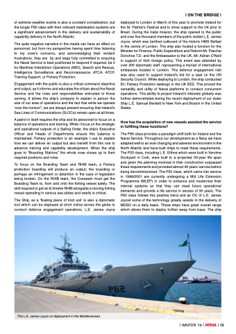 The P60 class provides a paradigm shift both for Ireland and the Naval Service. Throughout our development as a Navy we have adapted well to an ever changing and adverse environment in the North Atlantic and have built ships to meet these requirements. The P20 class, including L.E. Eithne which were built in Verolme Dockyard in Cork, were built to a projected 30-year life span and given the planning involved in their construction surpassed these requirements and provided almost 40 years’ service before being decommissioned. The P50 class, which came into service in 1999/2001 are currently undergoing a Mid Life Extension Programme (MLEP) in order to enhance and modernise their internal systems so that they can meet future operational demands and provide a life service in excess of 30 years. The P60 class follows this positive trend and as OC of L.E. James Joycet some of the technology greatly assists in the delivery of MDSO on a daily basis. These ships have great overall range which allows them to deploy further away from base. The ship