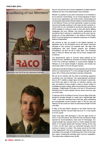 Minister, my address to you and to all present is not intended to be an exercise in fault finding. It is an honest appraisal of where we are as an organisation, and of the current, unfortunately and unnecessarily adversarial industrial relations climate that pertains to the Defence Forces; but most importantly it seeks to provide real and achievable solutions to this mess we find ourselves in. I know that you are committed to turning the ship around, and RACO pledges to continue to seek to work with Senior Military Leadership and your Officials, and provide professional and considered input, welcome or unwelcome as the case may be. Simply put, as key stakeholders in the Defence Forces family, RACO is and will always be an essential component of a healthy Defence Organisation.