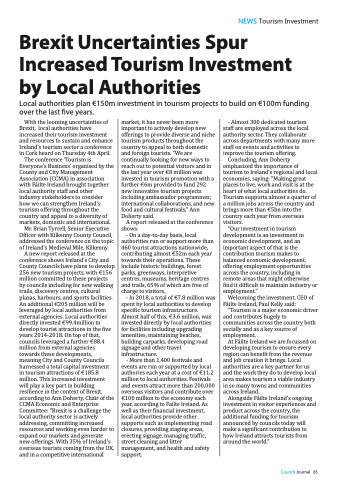 A new report released at the conference shows Ireland's City and County Councils have plans to develop 256 new tourism projects, with €156 million committed to these projects by councils including for new walking trails, discovery centres, cultural plazas, harbours, and sports facilities. An additional €205 million will be leveraged by local authorities from external agencies. Local authorities directly invested €99.4million to develop tourist attractions in the five years 2014-2018. On top of that, councils leveraged a further €88.4 million from external agencies towards these developments, meaning City and County Councils harnessed a total capital investment in tourism attractions of €185.8 million. This increased investment will play a key part in building resilience in the context of Brexit, according to Ann Doherty, Chair of the CCMA Economic and Enterprise Committee: "Brexit is a challenge the local authority sector is actively addressing, committing increased resources and working even harder to expand our markets and generate new offerings. With 35% of Ireland's overseas tourists coming from the UK, and in a competitive international