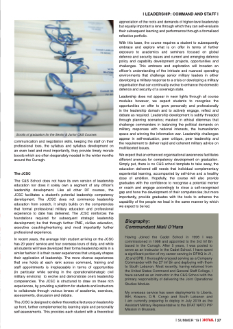 The C&S School does not have its own version of leadership education nor does it solely own a segment of any officer’s leadership development. Like all other DF courses, the JCSC facilitates a student’s potential leadership competency development. The JCSC does not commence leadership education from scratch, it simply builds on the competencies that formal professional military education and professional experience to date has delivered. The JCSC reinforces the foundations required for subsequent strategic leadership development; be that through further PME, civilian education, executive coaching/mentoring and most importantly further professional experience.