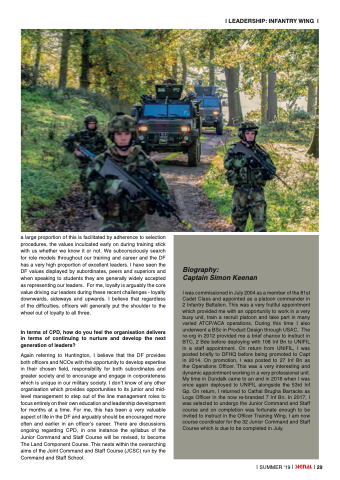 a large proportion of this is facilitated by adherence to selection procedures, the values inculcated early on during training stick with us whether we know it or not. We subconsciously search for role models throughout our training and career and the DF has a very high proportion of excellent leaders. I have seen the DF values displayed by subordinates, peers and superiors and when speaking to students they are generally widely accepted as representing our leaders. For me, loyalty is arguably the core value driving our leaders during these recent challenges - loyalty downwards, sideways and upwards. I believe that regardless of the difficulties, officers will generally put the shoulder to the wheel out of loyalty to all three.