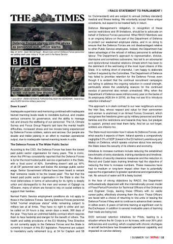 Defence Management’s obligation, in recognition of these service restrictions and IR limitations, should be to advocate on behalf of Defence Forces personnel. What RACO Members see is an ongoing failure on the part of the Department of Defence to protect our weakened employee status, and in so doing to ensure that the Defence Forces are not disadvantaged relative to other Public Service employees. Indeed, the Department has taken advantage of the refusal of military personnel to withdraw labour. The Department’s approach to representation, divisive, dismissive and sometimes subversive, has led to an adversarial and dysfunctional industrial relations climate which has been to the detriment of the well-being of the most loyal citizens of this State. It is nothing short of shameful. I am happy to elaborate further if required by the Committee. The Department of Defence has failed to prioritise retention for the Defence Forces even though it is evident that the continual recruitment campaigns are failing to address the ongoing reduction in overall strength, particularly where the underlying reasons for the continued exodus of personnel also remain unresolved. Why, when the Department of Defence saves millions every year on the backs of its employees (€26.5m in 2016), do they not see fit to introduce retention initiatives?
