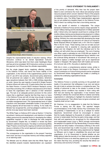 of the priority of demands. Why then has the project team failed to even commence the most critical and pressing human resource projects which concern retention? None of the projects completed to date are assessed to have any significant impact on the retention crisis. The White Paper Implementation approach has not yet yielded any tangible impact on the Defence Forces. RACO views it as nothing more than a box-ticking exercise.