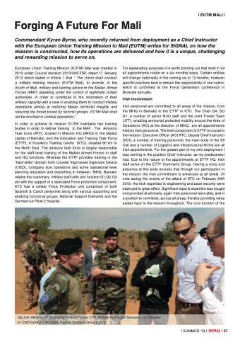 Commandant Kyran Byrne, who recently returned from deployment as a Chief Instructor with the European Union Training Mission to Mali (EUTM) writes for SIGNAL on how the mission is constructed, how its operations are delivered and how it is a unique, challenging and rewarding mission to serve on.