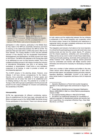 participation in other missions, particularly in the Middle East, as they relate to the MFA are essentially extraneous and have no bearing on the relationship between the MFA & EUTM. The particular tribal and inter-ethnic conflicts that exist in Mali are far more relevant. The Tuareg rebellion of 2012 and the potential inclusion of this ethnicity due the Accelerated Disarmament, Disengagement and Reintegration (A-DDR) process loom large on the horizon. The MFA’s own attitudes to the Tourag tribe need to be addressed as soon as they become evident. Part of the confidence building process in the mission involves the inclusion of International Humanitarian Law (IHL) in all training, both centralised, or decentralised. It itself forms a core mandatory component of all training, in order to provide a holistic, all- encompassing approach.