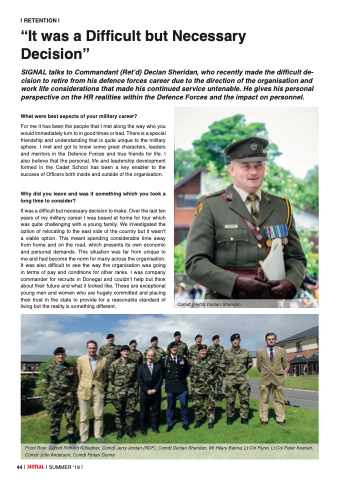 SIGNAL talks to Commandant (Ret’d) Declan Sheridan, who recently made the difficult de- cision to retire from his defence forces career due to the direction of the organisation and work life considerations that made his continued service untenable. He gives his personal perspective on the HR realities within the Defence Forces and the impact on personnel.