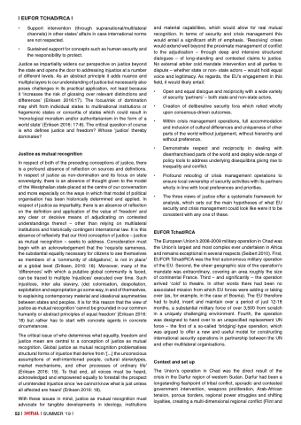 and material capabilities, which would allow for real mutual recognition. In terms of security and crisis management this would entail a significant shift of emphasis. ‘Resolving’ crises would extend well beyond the proximate management of conflict to the adjudication – through deep and intensive structured dialogues – of long-standing and contested claims to justice. No external arbiter cold mandate intervention and all parties to dispute – whether state or non- state actors – would hold equal voice and legitimacy. As regards, the EU’s engagement in this field, it would likely entail: