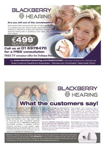 Blackberry Hearing was established in 2015. John Ryan and Dave Gleeson, the founders, drew on their long business experience to provide quality solutions at the best prices with exceptional customer care. “We built the business from scratch around the principles of affordability, transparency, quality and customer care”, says John. “How do we know we have succeeded? Because our customers tell us”. Blackberry Hearing has accumulated hundreds of validated customer Facebook comments on their website www. blackberryhearing.com/testimonials Some of the comments are below and all comments may be viewed on the Blackberry Hearing website.
