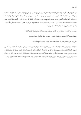 ﻣﺎ ﻧﺰد ﺧـﺪﯾﺠﻪ ﺑﻮدﯾﻢ ﺗﺎ ﺷﺐ ﻧﺰدﯾﮏ ﺷـﺪ ،ﺳـﭙﺲ ﺧـﺪﯾﺠﻪ ﮔﻔﺖ :ﻣﻦ از ﻋﻤﻮﯾﻢ ﻣﺤﻤﺪ ﺑﻦ ﻋﻠﯽ ﺻـﻠﻮات اﷲ ﻋﻠﯿﻪ ﺷـﻨﯿﺪم ﮐﻪ ﻣﯽ
