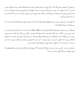 و وﺻـﯿﺘﯽ را ﮐﻪ ﭘﯿﻐﻤـﺒﺮ ﺻـﻠﯽ اﻟﻠّﻪ ﻋﻠﯿﻪ و آﻟﻪ راﺟﻊ ﺑﻪ او ﻧﻤﻮده و ﻧﺼـﺒﺶ ﻓﺮﻣﻮده و ﻣﺼـﯿﺒﺎﺗﯿﮑﻪ ﺑﺂﻧﻬـﺎ ﻣﯿﺮﺳـﺪ و اﻋـﺘﺮاف ﺣﺴﻦ و