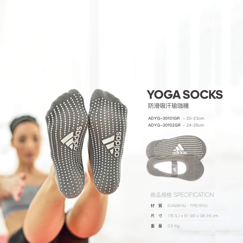 YOGA SOCKS 防滑吸汗瑜珈襪 ADYG-30101GR - 20~23cm ADYG-30102GR - 24~26cm 商品規格 SPECIFICATION 材 質 EVA(85%)、TPE(15%) 尺 寸 176(L)x61(W)x08(H)cm 重 量 0.5Kg