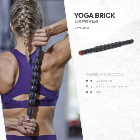 YOGA BRICK 按摩舒緩滾輪棒 ADTB-11608 商品規格 SPECIFICATION 材 質 EVA高密度材質 尺 寸 22.8(L)x15.2(W)x7.6(H)cm 重 量 輕量化