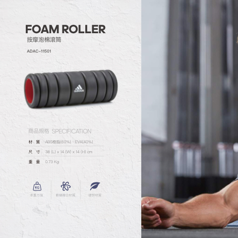 FOAM ROLLER 按摩泡棉滾筒 ADAC-11501 商品規格 SPECIFICATION 材 質 ABS樹脂(60%)、EVA(40%) 尺 寸 38(L)x14(W)x14(H)cm 重 量 0.73Kg 承重力強 軟硬複合材質 環保材質