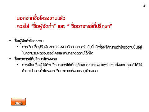 • การเขียนชือผู้รับผิดชอบโครงงานวิทยาศาสตร์ เป�นสิงดีเพือจะได้ทราบว่าโครงงานนั�นอยู่