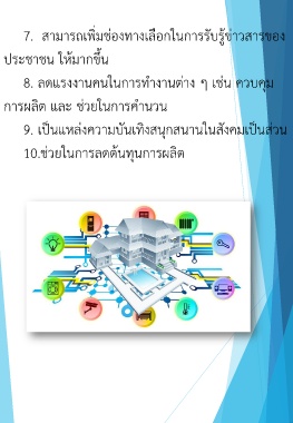 7. สำมำรถเพิ่มช่องทำงเลือกในกำรรับรู้ข่ำวสำรของ ประชำชน ให้มำกขึ้น 8. ลดแรงงำนคนในกำรท ำงำนต่ำง ๆ เช่น ควบคุม กำรผลิต และ ช่วยในกำรค ำนวน 9. เป็นแหล่งควำมบันเทิงสนุกสนำนในสังคมเป็นส่วน 10.ช่วยในกำรลดต้นทุนกำรผลิต