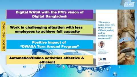 16 Digital WASA with the PM’s vision of Digital Bangladesh Lesson learned Work in challenging situation with less employees to achieve full capacity Positive impact of “DWASA Turn Around Program” Automation/Online activities effective & efficient