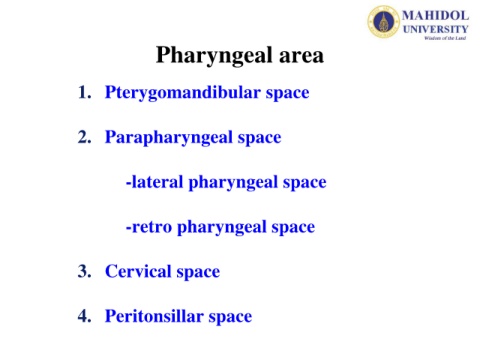 Pharyngeal area 1. Pterygomandibular space 2. Parapharyngeal space -lateral pharyngeal space -retro pharyngeal space 3. Cervical space 4. Peritonsillar space