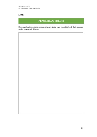 Modul Kewirausahaan Dr. Dadang Juandi & Dr. Aan Hasanah LKM-3 PEMILIHAN SOLUSI Berdasar kegiatan sebelumnya, silakan Anda buat solusi terbaik dari rencana usaha yang telah dibuat. 34