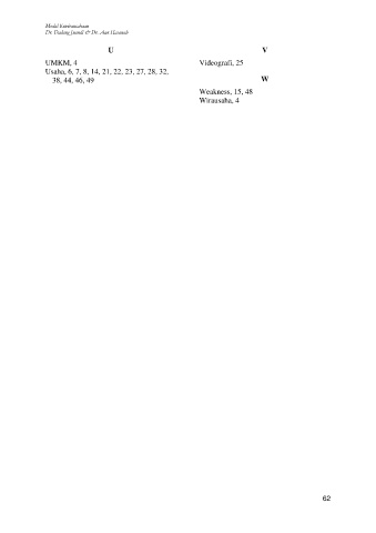 Modul Kewirausahaan Dr. Dadang Juandi & Dr. Aan Hasanah U V UMKM, 4 Videografi, 25 Usaha, 6, 7, 8, 14, 21, 22, 23, 27, 28, 32, 38, 44, 46, 49 W Weakness, 15, 48 Wirausaha, 4 62
