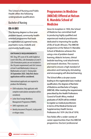 of Medicine and Bachelor of Surgery (MBChB). After meeting the requirements prescribed by the Health Professions Council of South Africa, medical graduates of UKZN will be entitled