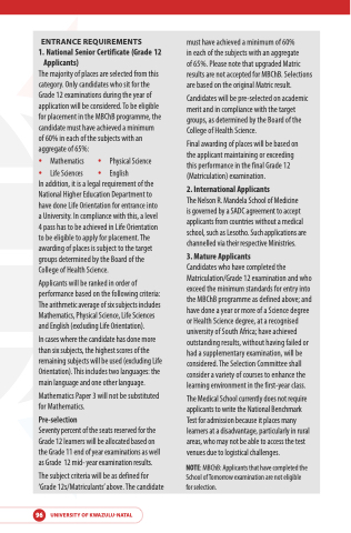The majority of places are selected from this category. Only candidates who sit for the Grade 12 examinations during the year of application will be considered. To be eligible for placement in the MBChB programme, the candidate must have achieved a minimum of 60% in each of the subjects with an aggregate of 65%: