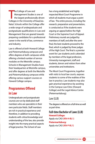 the largest professionally-driven Colleges in the University of KwaZulu- Natal. Schools within the College offer a wide range of undergraduate and postgraduate qualifications in Law and Management that are geared towards preparing candidates for a professional career in the world of law, commerce and industry.