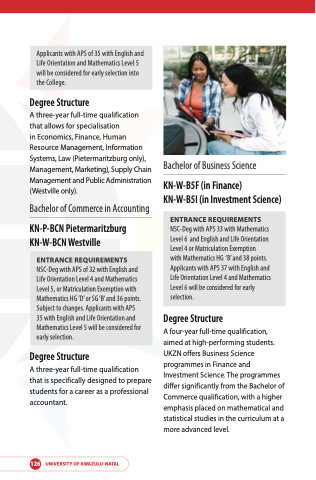 in Economics, Finance, Human Resource Management, Information Systems, Law (Pietermaritzburg only), Management, Marketing), Supply Chain Management and Public Administration (Westville only).
