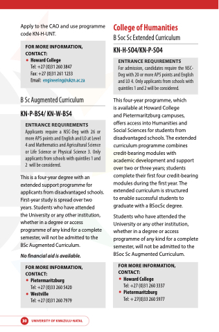 and Pietermaritzburg campuses, offers access into Humanities and Social Sciences for students from disadvantaged schools. The extended curriculum programme combines credit-bearing modules with academic development and support over two or three years; students complete their first four credit-bearing modules during the first year. The extended curriculum is structured
