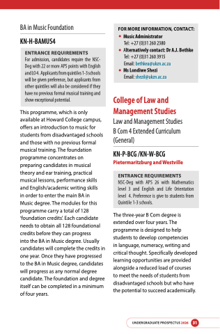This programme, which is only available at Howard College campus, offers an introduction to music for students from disadvantaged schools and those with no previous formal musical training. The foundation programme concentrates on preparing candidates in musical theory and ear training, practical musical lessons, performance skills and English/academic writing skills