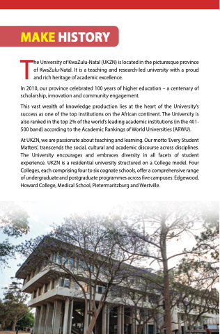 At UKZN, we are passionate about teaching and learning. Our motto ‘Every Student Matters’, transcends the social, cultural and academic discourse across disciplines. The University encourages and embraces diversity in all facets of student experience. UKZN is a residential university structured on a College model. Four Colleges, each comprising four to six cognate schools, offer a comprehensive range of undergraduate and postgraduate programmes across five campuses: Edgewood, Howard College, Medical School, Pietermaritzburg and Westville.
