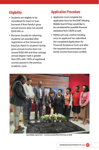 • Bursaries (mostly for returning students) are awarded after registration at the University of KwaZulu-Natal if a student’s family gross annual income does not exceed R300 000 and their average annual degree mark is greater than 65% with 100% of registered courses passed in the previous academic cycle.