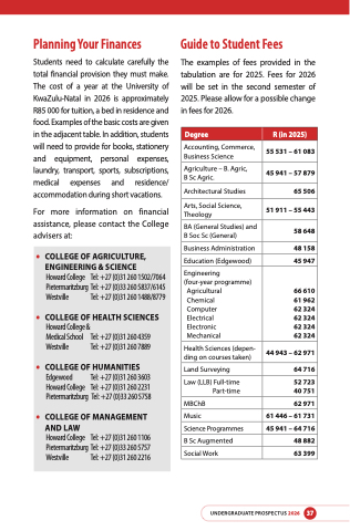 Students need to calculate carefully the total financial provision they must make. The cost of a year at the University of KwaZulu-Natal in 2026 is approximately R85 000 for tuition, a bed in residence and food. Examples of the basic costs are given in the adjacent table. In addition, students will need to provide for books, stationery and equipment, personal expenses, laundry, transport, sports, subscriptions, medical expenses and residence/ accommodation during short vacations.