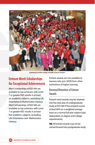 Merit Scholarships of R25 000 are available to top achievers with Level 7 or greater NSC results in at least six academic subjects, excluding Life Orientation & Mathematics Literacy. Merit Scholarships of R20 000 are available to top achievers with Level 7 or greater NSC results in at least five academic subjects, excluding Life Orientation and Mathematics Literacy.