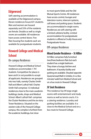 Howard College and Medical School residences accommodate 1 701 students. Competition for places is keen and it is not possible to accept
