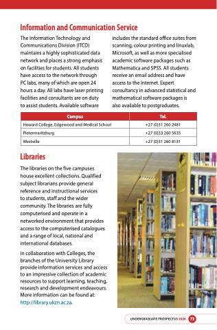 In collaboration with Colleges, the branches of the University Library provide information services and access to an impressive collection of academic resources to support learning, teaching, research and development endeavours. More information can be found at: http://library.ukzn.ac.za.