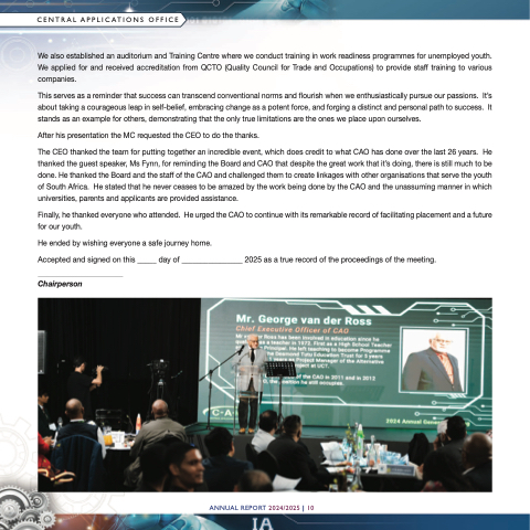 The CEO thanked the team for putting together an incredible event, which does credit to what CAO has done over the last 26 years. He thanked the guest speaker, Ms Fynn, for reminding the Board and CAO that despite the great work that it’s doing, there is still much to be done. He thanked the Board and the staff of the CAO and challenged them to create linkages with other organisations that serve the youth of South Africa. He stated that he never ceases to be amazed by the work being done by the CAO and the unassuming manner in which universities, parents and applicants are provided assistance.