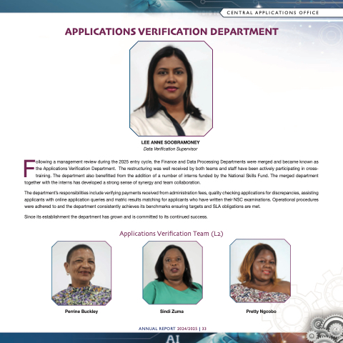 Following a management review during the 2025 entry cycle, the Finance and Data Processing Departments were merged and became known as the Applications Verification Department. The restructuring was well received by both teams and staff have been actively participating in cross- training. The department also benefitted from the addition of a number of interns funded by the National Skills Fund. The merged department