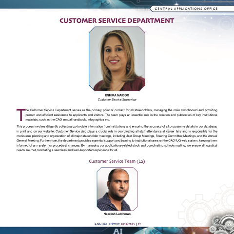 The Customer Service Department serves as the primary point of contact for all stakeholders, managing the main switchboard and providing prompt and efficient assistance to applicants and visitors. The team plays an essential role in the creation and publication of key institutional materials, such as the CAO annual handbook, Infographics etc.