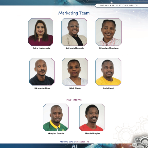Marketing Team CENTRAL APPLICATIONS OFFICE Selina Haripersadh Luthando Masadala Sithandiwe Mazubane Sithembiso Nkosi Mbali Sibeko NSF Interns Anele Zweni Nkanyiso Guambe Mandla Mbuyisa ANNUAL REPORT 2024/2025 | 43