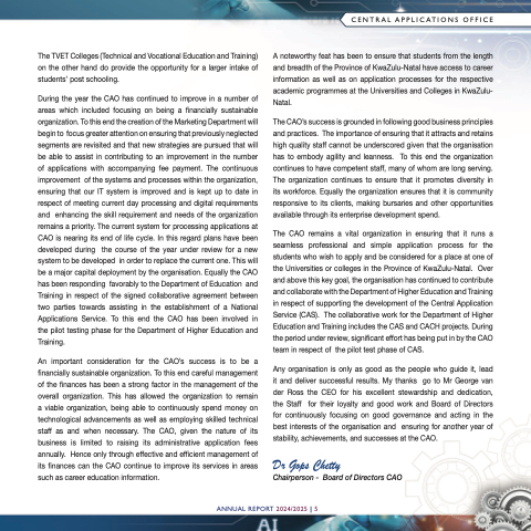 During the year the CAO has continued to improve in a number of areas which included focusing on being a financially sustainable organization. To this end the creation of the Marketing Department will begin to focus greater attention on ensuring that previously neglected segments are revisited and that new strategies are pursued that will be able to assist in contributing to an improvement in the number of applications with accompanying fee payment. The continuous improvement of the systems and processes within the organization, ensuring that our IT system is improved and is kept up to date in respect of meeting current day processing and digital requirements and enhancing the skill requirement and needs of the organization remains a priority. The current system for processing applications at CAO is nearing its end of life cycle. In this regard plans have been developed during the course of the year under review for a new system to be developed in order to replace the current one. This will be a major capital deployment by the organisation. Equally the CAO has been responding favorably to the Department of Education and Training in respect of the signed collaborative agreement between two parties towards assisting in the establishment of a National Applications Service. To this end the CAO has been involved in the pilot testing phase for the Department of Higher Education and Training.