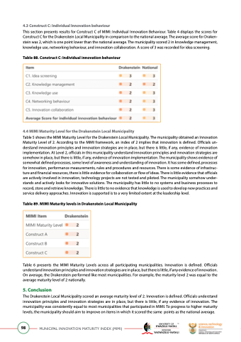This section presents results for Construct C of MIMI: Individual Innovation Behaviour. Table 4 displays the scores for Construct C for the Drakenstein Local Municipality in comparison to the national average. The average score for Draken- stein was 2, which is one point lower than the national average. The municipality scored 2 in knowledge management, knowledge use, networking behaviour, and innovation collaboration. A score of 3 was recorded for idea screening.