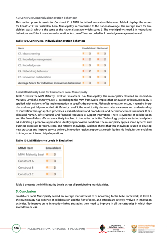 This section presents results for Construct C of MIMI: Individual Innovation Behaviour. Table 4 displays the scores for Construct C for Emalahleni Local Municipality in comparison to the national average. The average score for Em- alahleni was 3, which is the same as the national average, which scored 3. The municipality scored 2 in networking behaviour, and 3 for innovation collaboration. A score of 2 was recorded for knowledge management as well.