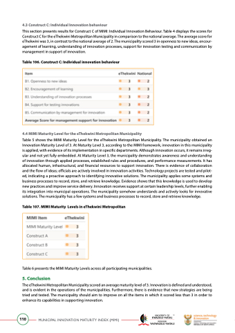 This section presents results for Construct C of MIMI: Individual Innovation Behaviour. Table 4 displays the scores for Construct C for the eThekwini Metropolitan Municipality in comparison to the national average. The average score for eThekwini was 3, in contrast to the national average of 2. The municipality scored 3 in openness to new ideas, encour- agement of learning, understanding of innovation processes, support for innovation testing and communication by management in support of innovation.