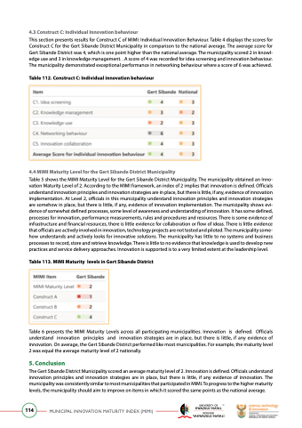 This section presents results for Construct C of MIMI: Individual Innovation Behaviour. Table 4 displays the scores for Construct C for the Gert Sibande District Municipality in comparison to the national average. The average score for Gert Sibande District was 4, which is one point higher than the national average. The municipality scored 2 in knowl- edge use and 3 in knowledge management. . A score of 4 was recorded for idea screening and innovation behaviour. The municipality demonstrated exceptional performance in networking behaviour where a score of 6 was achieved.