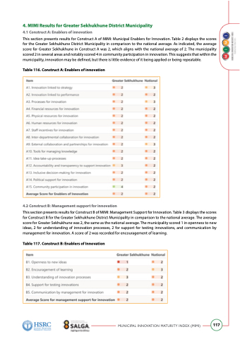 This section presents results for Construct A of MIMI: Municipal Enablers for Innovation. Table 2 displays the scores for the Greater Sekhukhune District Municipality in comparison to the national average. As indicated, the average score for Greater Sekhukhune in Construct A was 2, which aligns with the national average of 2. The municipality scored 2 in several areas and notably scored 4 in community participation in innovation. This suggests that within the municipality, innovation may be defined, but there is little evidence of it being applied or being repeatable.