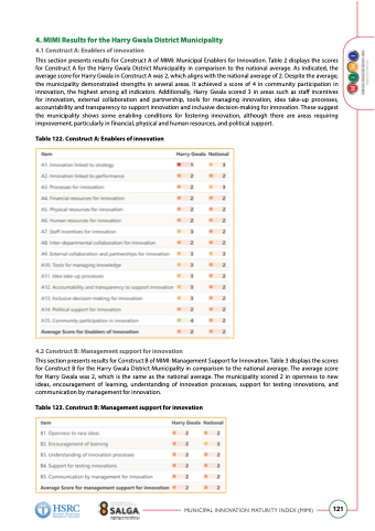 This section presents results for Construct B of MIMI: Management Support for Innovation. Table 3 displays the scores for Construct B for the Harry Gwala District Municipality in comparison to the national average. The average score for Harry Gwala was 2, which is the same as the national average. The municipality scored 2 in openness to new ideas, encouragement of learning, understanding of innovation processes, support for testing innovations, and communication by management for innovation.